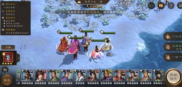 五、打法过程:1、开局曹操加移动。2、战场主要分为三块,左中右,分兵去救的话输出不够,所以选右路。3、全军向右侧移动。