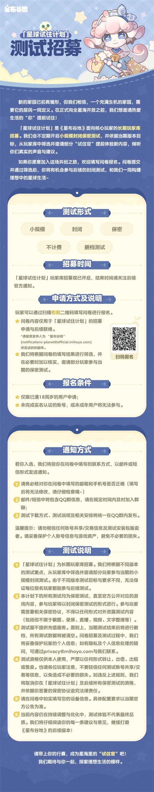 「星球试住计划」是《星布谷地》面向核心玩家的长期玩家库招募。我们会不定期开启小规模封闭保密测试,并依据当期版本目标,从玩家库中筛选并邀请部分“试住官”提前体验新内容,倾听你们真实的声音与建议。
