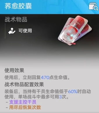 2、其核心优势在于智能触发机制:当装备该胶囊的干员生命值降至60%以下时,系统将自动执行使用动作,全程无需手动干预。每场战斗最多可触发3次,覆盖多数中等时长作战节奏。
