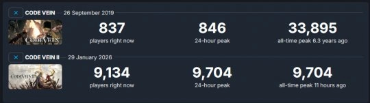Steam的在线峰值数据同样不尽如人意。据SteamDB统计显示,《噬血代码2》在Steam平台的同时在线峰值未达万人,仅为9704人;而六年前推出的《噬血代码1》,其Steam在线峰值则有33895人。由此可见,《噬血代码2》的在线人数甚至不足前作的三分之一。
