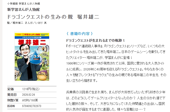 小学馆宣布,以传奇游戏制作人、《勇者斗恶龙》生父堀井雄二为主题的教育类新漫画《勇者斗恶龙的生父 堀井雄二》正式公布,该漫画预定于2月24日发行,将系统且真实地讲述这位大师的游戏制作事迹,敬请期待。