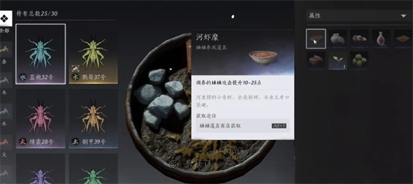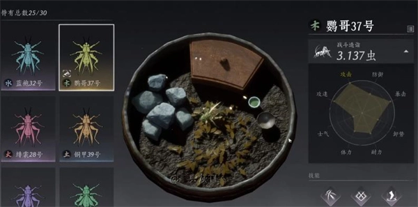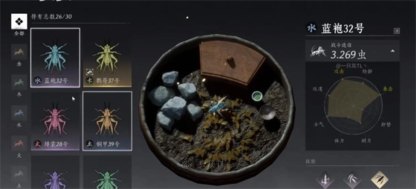 6、培养蛐蛐时,首先得关注它的造诣属性,再依据属性选用对应的药水道具。每只蛐蛐最多能使用5瓶药水,因此要做好合理分配。另外,每只蛐蛐最好搭配一个主动技能和两个被动技能,主动技能不要随便去洗,否则很可能出现三个被动技能的尴尬局面。