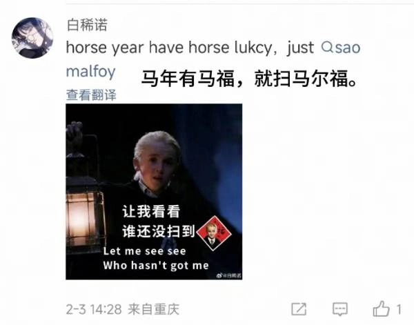 2026年农历马年日益临近,不少中国网友留意到,“马尔福”(Malfoy)这一译名里,“马”字恰好对应即将到来的生肖马年,“福”字又承载着传统的吉祥寓意,整体看来十分讨喜吉祥。