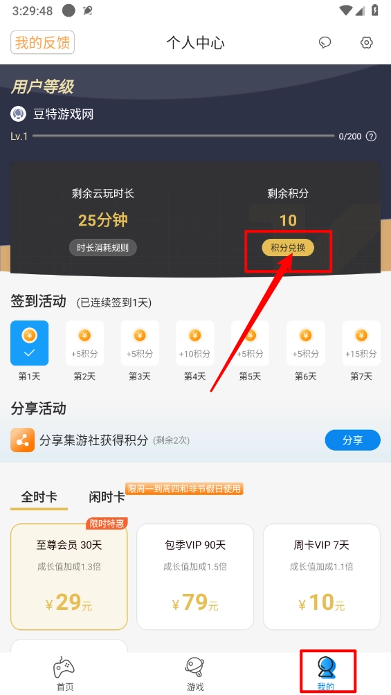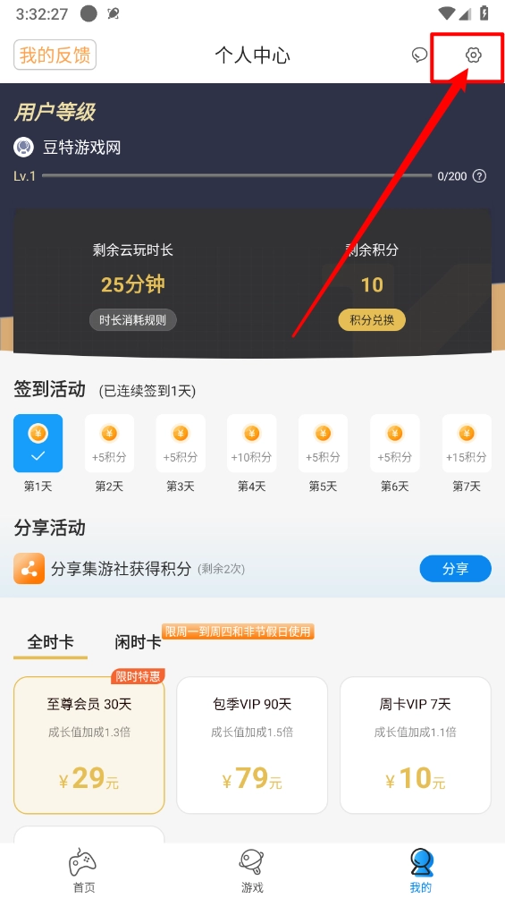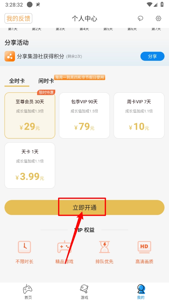 进入个人中心页面,滑动到最底部开通VIP,就能无限试玩游戏啦。