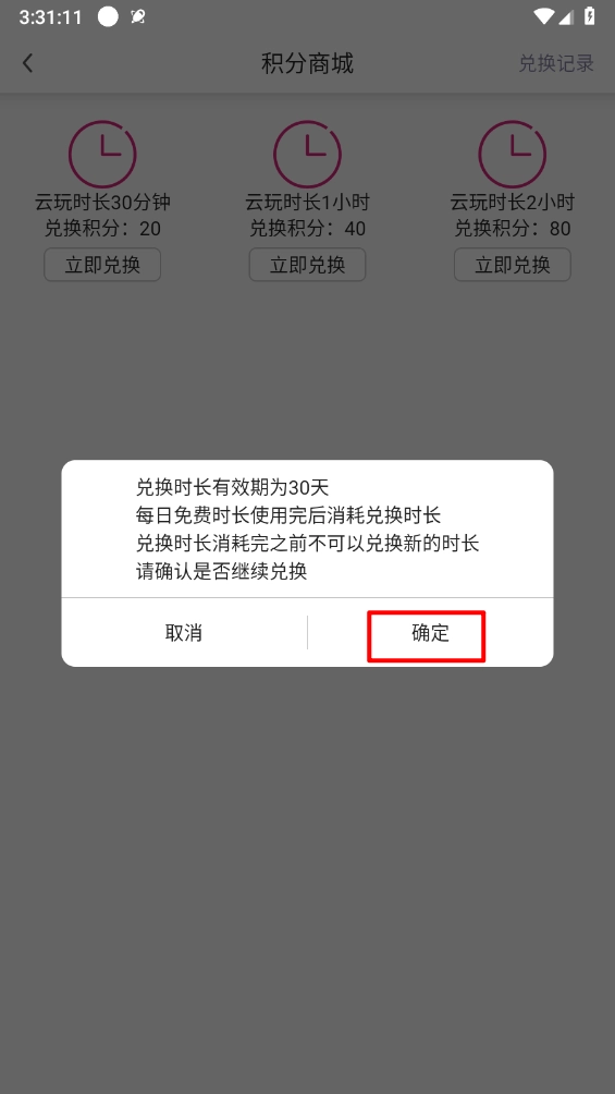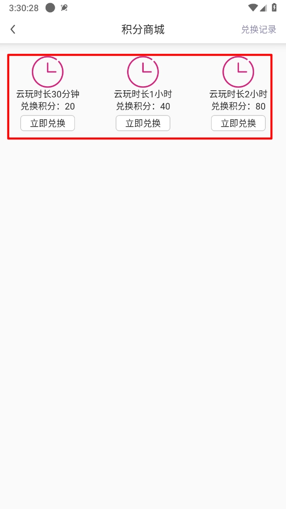 如图所示,在积分商城里挑选对应的时长后,点击“立即兑换”按钮即可。