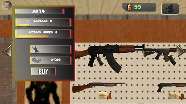 每种武器都清晰展示着名称、伤害、攻击速度、子弹规格与价格信息,像AK74的售价就是2500美金。