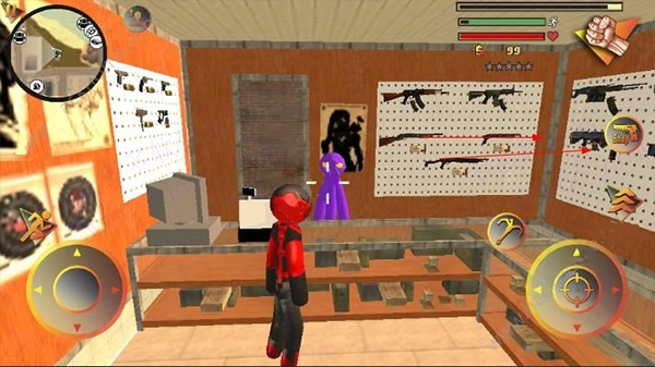 左侧控制移动与加速,右侧对应绳索和攻击(含跳跃功能),跳跃键独立设置;右上区域的武器切换界面、血量及经验值均实时动态更新,信息清晰直观。玩家可自由选择玩法风格,与其他帮派成员展开激烈交火——击杀敌人能获取经验值,连续击杀会累积星级,届时警察与周边角色将对你重点“关照”,发起猛烈攻势。如何在枪林弹雨中存活,同时成功消灭对手,便是你需要完成的核心任务。