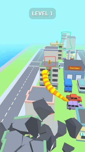 这是一款操控蛇形角色破坏城市建筑的休闲游戏。玩家只需滑动手指,就能引导贪吃蛇吞噬物品、摧毁城市设施,蛇身会随着吞噬进度不断变长变大。游戏画面简约、操作简单,玩家可通过提升能力与运用技巧,将建筑物逐一化为瓦砾,享受独特的破坏乐趣。