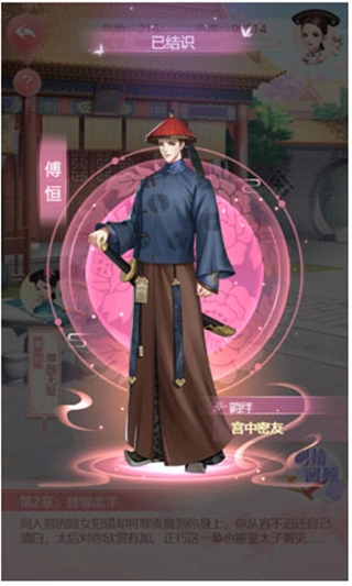 聊完剧情,再说说大家都很期待的知己系统。只要通关剧情1-初入宫廷这一关卡,就能解锁知己功能了。在一段英雄救美的情节之后,那位贴心的侍卫傅恒就被小主成功收服啦。