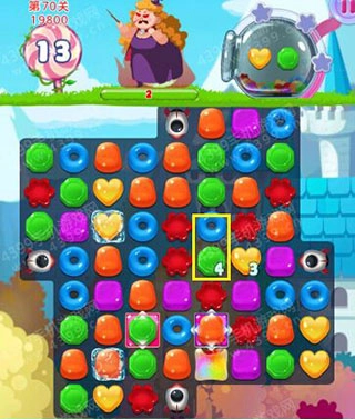 关卡目标:通过消除黄色与绿色的糖果,来击败拥有200点生命值的胖女巫。