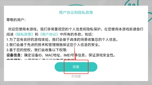 首先,请阅读并同意个人信息保护指引,随后点击“同意”按钮即可进入游戏。