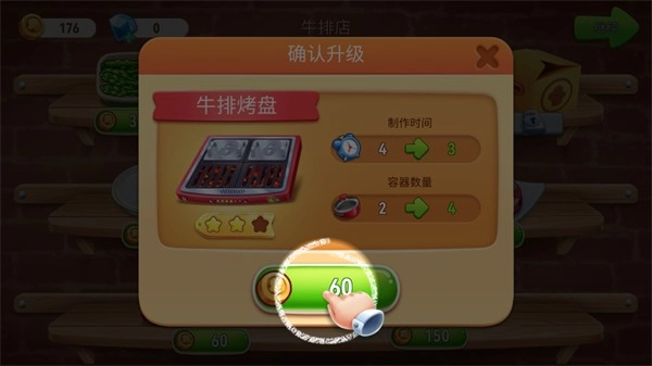 升级食材与厨具——升级食材能提升你的收入,升级厨具可缩短烹饪时间。