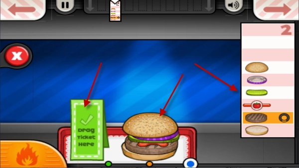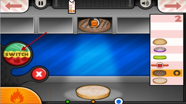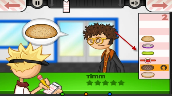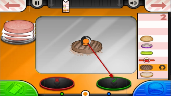 接下来要做的就是制作汉堡了,左边的按钮能切换肉饼和其他辅料,根据右侧客人的需求依次添加辅料就行。