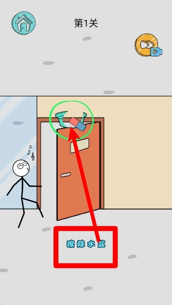 点击“擦除水盆”按钮能直接移除陷阱装置,这样火柴人就能安心进门,不会被水盆意外砸中而导致闯关失败。