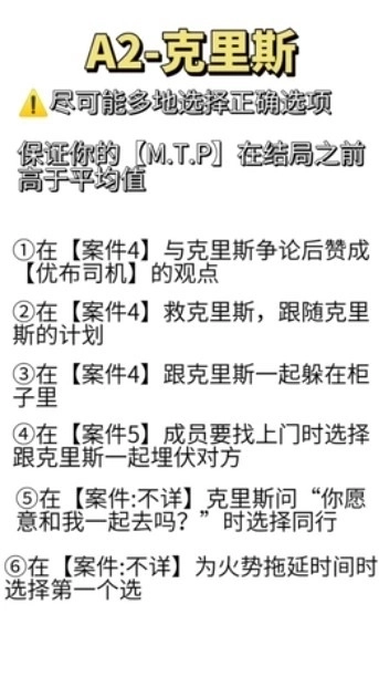 多选择和克里斯相关的选项,最后在警局与克里斯一同躲藏时,躲进同一个柜子确保两人都能存活。另外,若需要在摊主和德米之间做出选择,请挑选德米那条偏向积极的想法。需要注意的是,在克里斯线的最终事件中,要是反复提及德米或者头儿,就可能跳转到德米线或者头儿线。要是不想跳转的话,就选择和克里斯有关的选项。