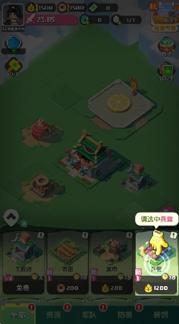先修建兵营吧,点击兵营选中兵营即可快速修建。