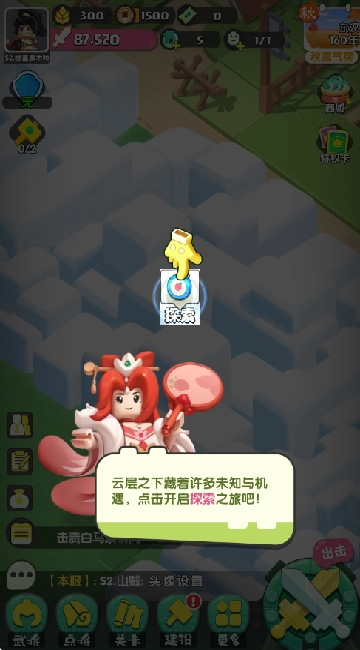 云层之下仍潜藏着诸多未知挑战,点击云层去探寻那些未被发现的城池吧,带上你的兵营,一同攻克这些城池。