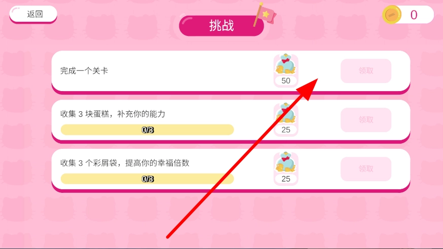 在挑战界面中,存在着各式各样的任务,比如收集蛋糕、彩屑袋之类的物品。当你完成这些任务后,就可以领取相应的奖励。而这些奖励能够用于后续角色能力的升级等方面,从而推动整个旅行的进程。