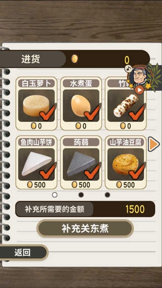 首先得先采购食材,每个顾客偏好的关东煮各不相同,刚开始只有三种口味,但可以先吸引一批客人来光顾,每次会有三位客人进店。随着收入的不断累积,关东煮的品类也会逐步解锁;当营业额超过10万后,每再增加10万就能解锁一款新的关东煮。不过不用太担心,赚钱的速度还是比较快的。