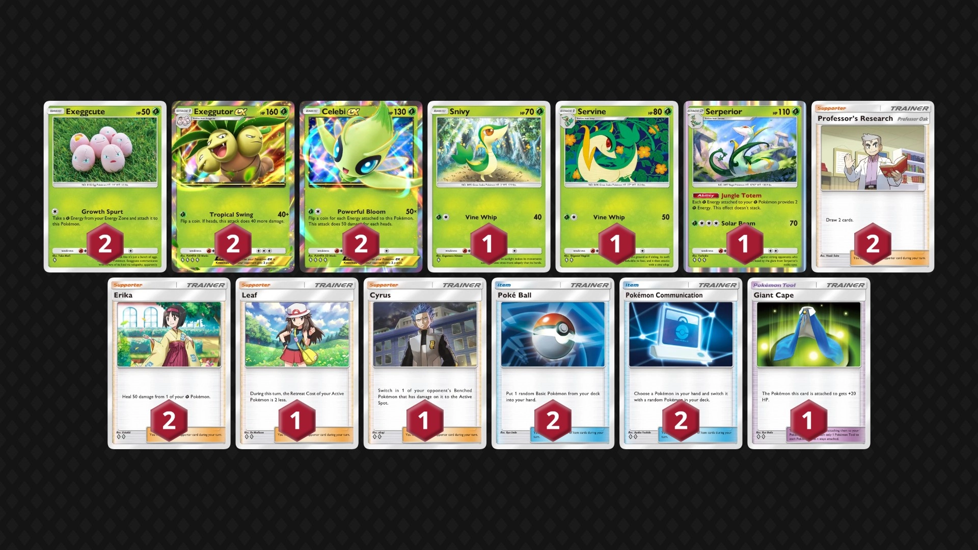 目前椰蛋树ex的卡组构建还未定型,可根据个人喜好选择携带1-2张时拉比、谢米、梦幻,或是1-2组远古巨蜓ex。若起手频繁能拿到时拉比加精灵球,可把1张娜姿换成速度强化,不然很容易卡手,面对快攻会十分被动。