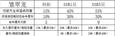 雏翠龙作为主战角色时,共有4项加成效果。其中,普攻/绝招伤害减免是升级到SSR品质时额外解锁的加成;终结技控制状态的命中提升,以及永久增加普攻/绝招伤害这两项,在达到SSR后数值便不再增长;而SSR阶段对敌方全体造成的伤害提升幅度也相对有限。因此星辰建议,将主战的雏翠龙培养至SSR1星即可停止。