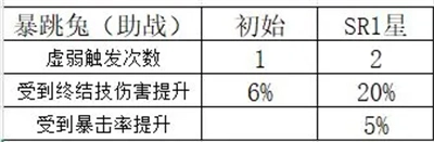 暴跳兔作为助战角色时,会触发【虚弱】天赋效果,该效果能让我方队伍对敌方目标的终结技伤害得到增强;当暴跳兔进化至SR品质后,还可额外提升我方对指定敌方单位的暴击率。不过,通过升星途径为暴跳兔带来的数值属性加成相对有限。