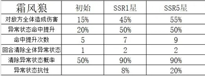霜风狼主在战斗时,能提升终结技的异常状态命中概率,回合结束时还会清除全体的异常状态。进化到SSR品质后,它会额外获得异常状态抗性,但异常状态命中的提升效果和清除异常状态的概率不会再进一步增加,对敌方全体造成的伤害提升也比较有限,星辰建议将其升级到SSR1星就可以停止了。