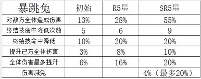 暴跳兔在主战情况下,SR进化后依靠升星带来的数值提升幅度比较大。不过现在,99%的团长都把它放在助战位置;助战状态时,【虚弱】效果触发条件虽简单,但存在较多限制,而且升星增加的数值也少,所以非常不建议大家给暴跳兔升级。