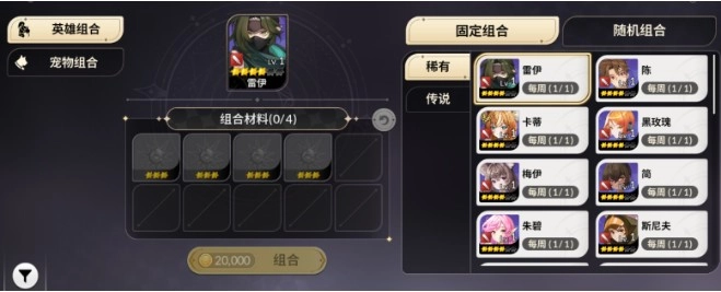 主界面左下角的“工坊”入口,进入后选择“组合”分类下的“英雄组合”,即可打开对应界面。在这里,消耗四个三星狗粮能兑换一个四星稀有角色。建议尽量将所有兑换机会用掉:属性强力的四星稀有角色可留作后续自行突破培养,而强度一般的则能作为五星角色强化升级时的狗粮素材,这样能显著减少对三星狗粮的消耗。