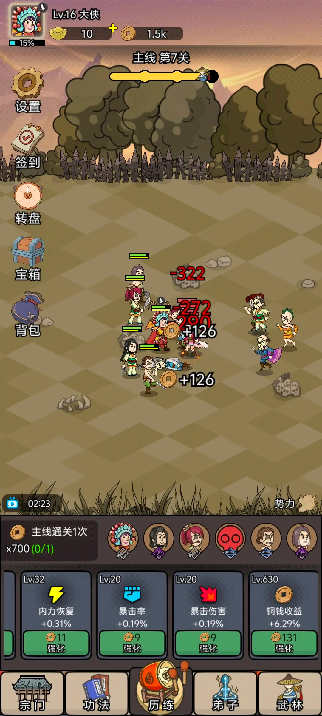 前期属性升级时,除了满足任务要求外,尽量把收益属性面板拉到最高,这样推图掉落的铜钱会非常多。有了足够的铜钱就能升级弟子,推图的速度也会快很多。