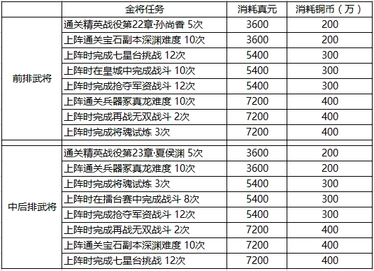 根据图示内容,处于相同站位的武将所对应的进阶任务是完全一致的;另外在12.0版本里,真元每日的极限产出量大约维持在7000左右。综合考量任务推进的进度以及资源获取的进度这两方面因素,主公想要完成一名武将的金将进阶任务,所需的时间大致在7到11天的区间范围内。