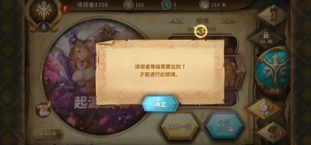 给角色注魂,角色升级,最高不超过谛视者等级。