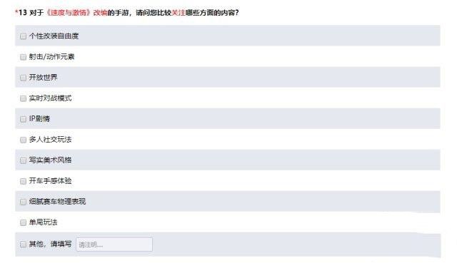 在调查问卷中,询问玩家对于《速度与激情》更倾向于哪种玩法,看来腾讯即将要开发《速度与激情》游戏了。