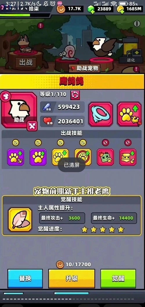 前期选择:推图时先用老鹰,等老鹰的输出占比降到10%以下,就换成狗狗来过渡。