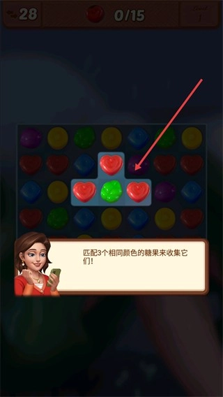 在三消关卡里,通过交换相邻的糖果,让三个颜色相同的糖果连成一条直线,以此收集指定的目标糖果,从而达成关卡的任务要求。