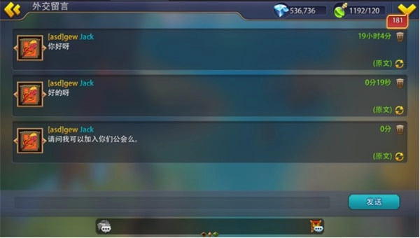3. 公会外交主要用于公会对外事务的沟通面板。公会外部成员可在公会外交留言上发送消息。公会成员可以进行回复、公会会长和副会长可删除外交留言商店恶信息。