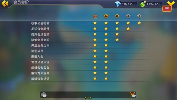 2. 在公会里,成员都有等级,分为:会长、副会长、精英、高级成员、初级成员5个等级。会长与副会长可作为公会管理者可以更改公会内外公告、处理公会申请、驱逐成员。公会会长可以更改公会名称、代号、微章、解散公会、变更所属王国。
