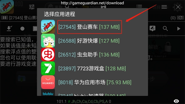 点击GameGuardian的悬浮窗,然后选择《登山赛车》这款游戏。