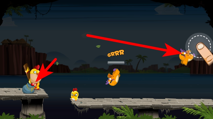 在战斗时,点击小鸡所在的位置,利用道具对前方的目标怪物发起攻击。