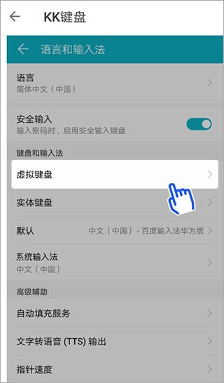 另外,大家也可以前往手机的设置界面,找到“语言和输入法”选项,然后在“虚拟键盘”的相关设置中,将KK键盘设为默认输入法。