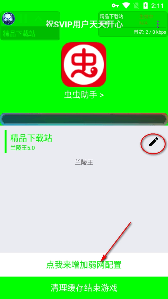 :不需要设置弱网络环境或权限,打开相应的游戏可以测试其运行速度,所以每个人都可以放心使用。打开软件主页后,点击配置旁边的笔形图标,是对原有配置进行修改操作。