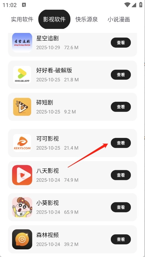 进入首页后,能看到详细的软件资源分类,其中涵盖了影视类、小说类和音乐类。