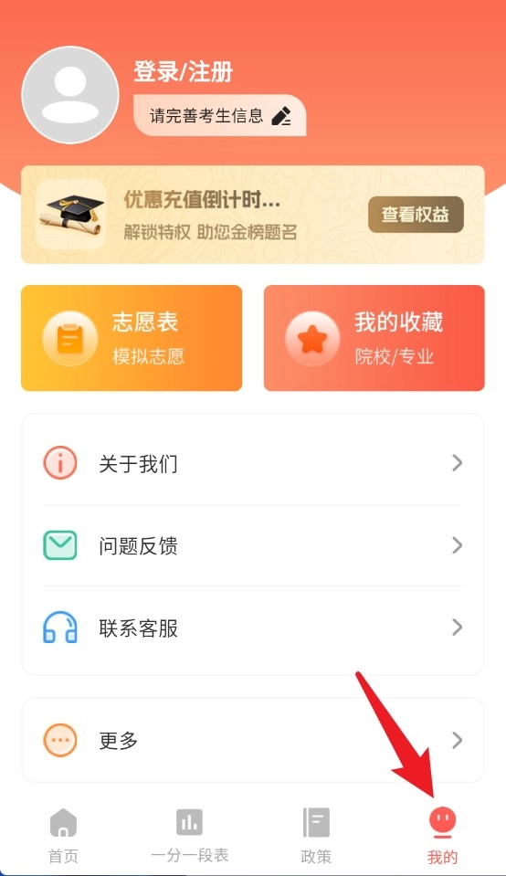 我的页面支持账号登录,能查看志愿表、收藏内容,还可以提交问题反馈以及联系客服。