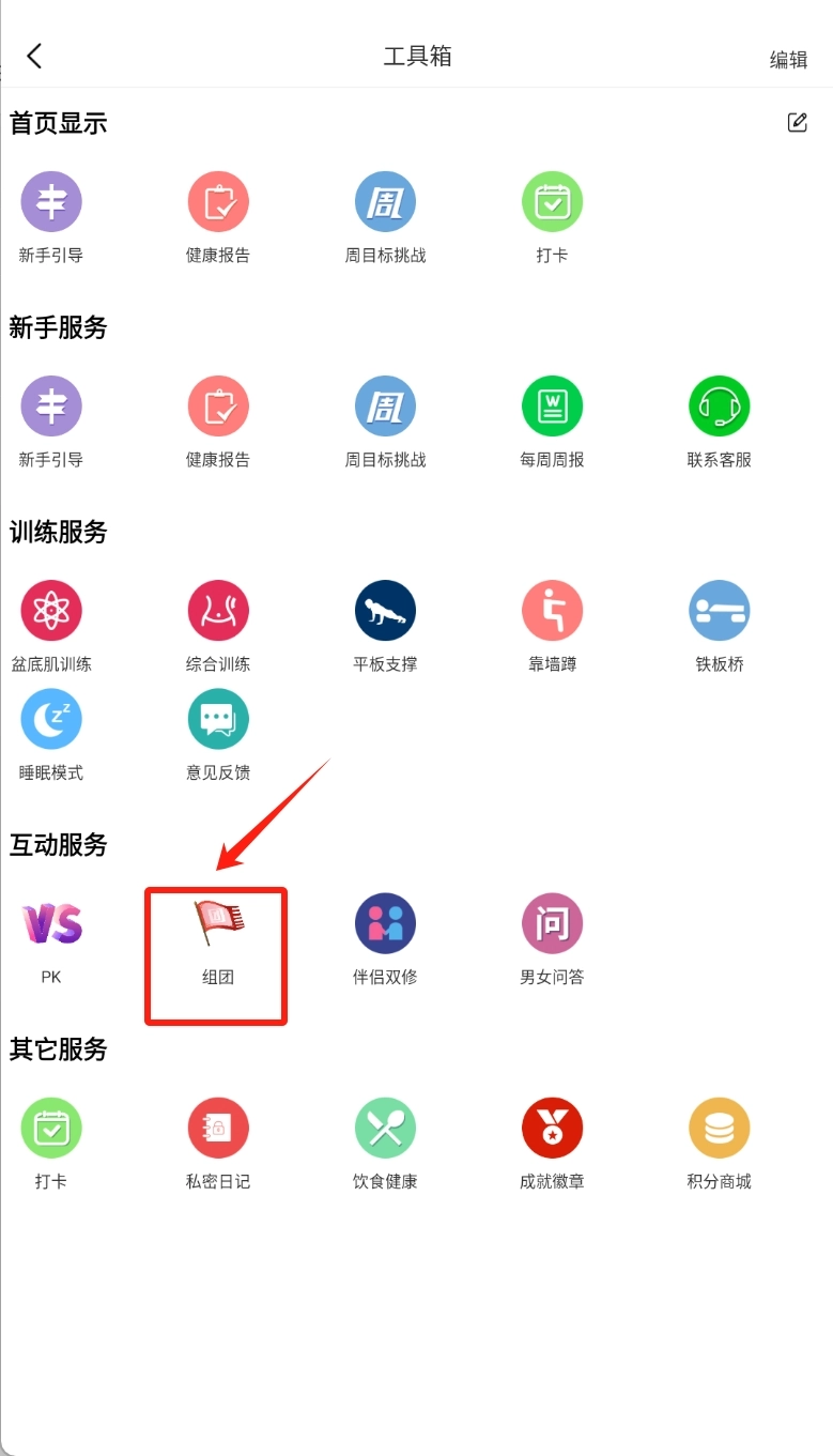 工具箱主要包含首页展示、新手服务、训练服务、互动服务和其他服务等板块,若有入团需求,可点击互动服务中的组团选项。