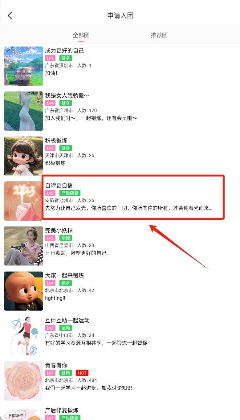 申请入团被划分为全部团和推荐团两个板块,选择其中一个板块点击即可进入详情页面。