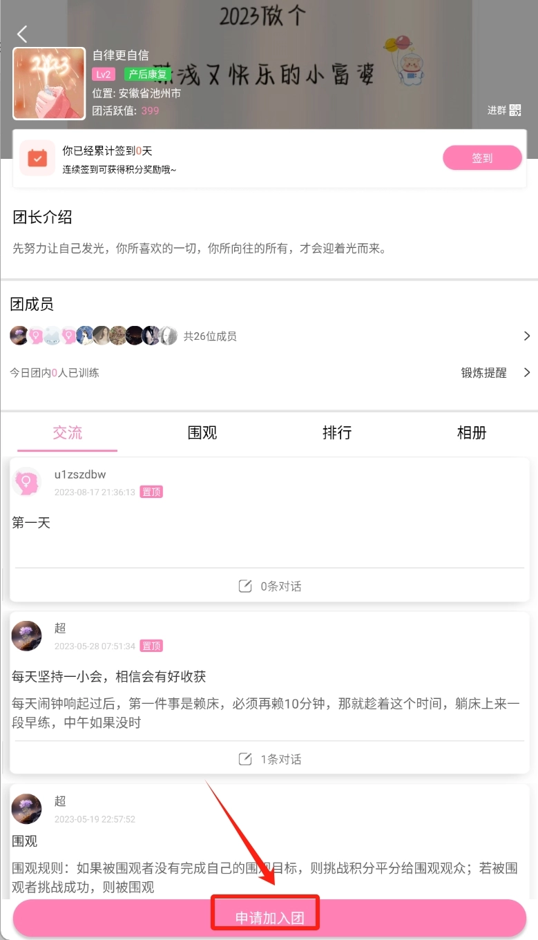 进团之后,你就能每天在这里点击签到了。不过入团得经过团长同意,在这里你可以看到团里的成员都有谁,还能了解他们的活跃值。点击下方的“申请加入团”按钮,要是确定想加入,直接点击确定就行。