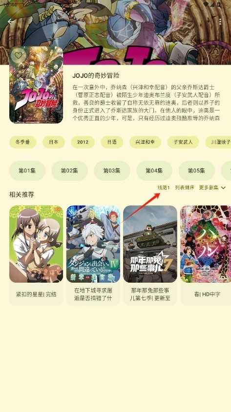 选择好目标动漫后,就会进入到包含作品简介、集数列表等信息的详情页面。开始播放之后,要留意播放器中间偏右的位置有一个“线路”按钮,点击它就能展开当前可以使用的所有播放线路选项。