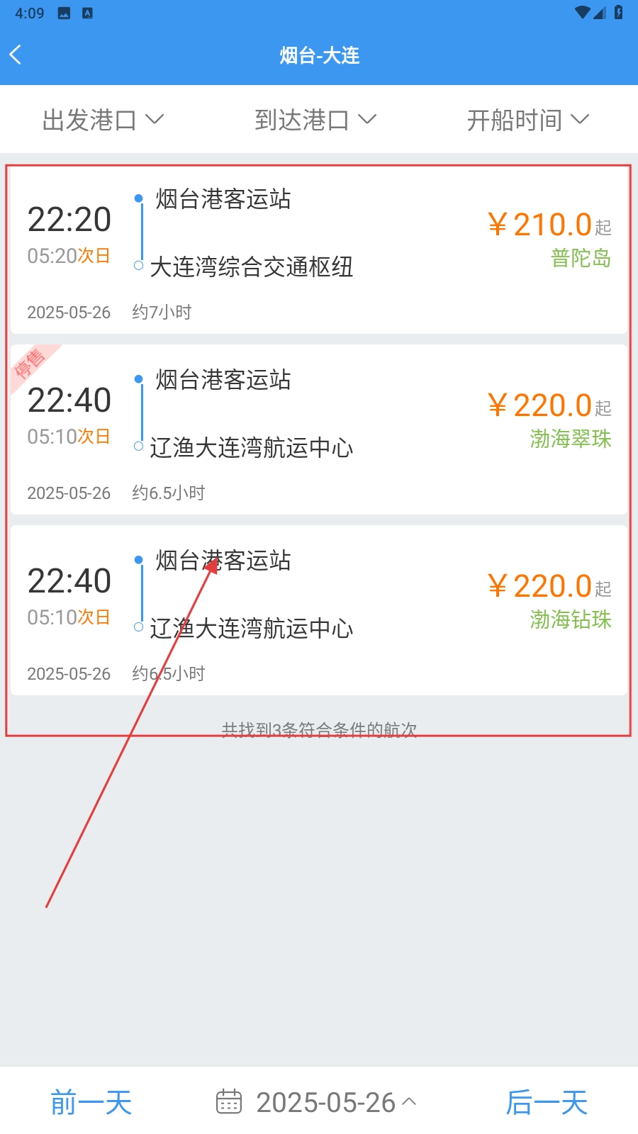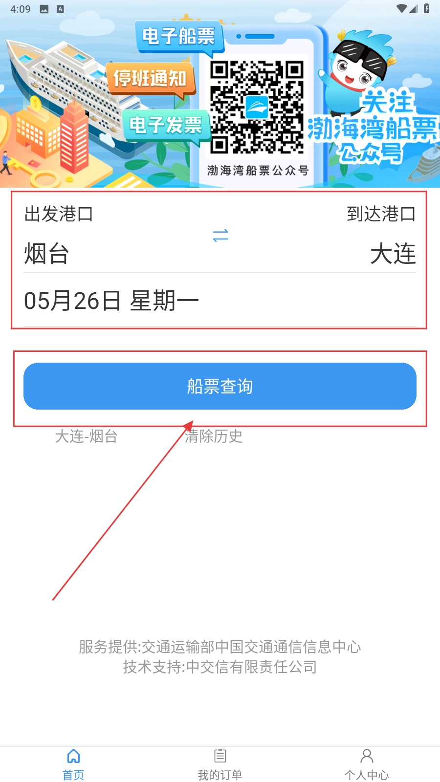 打开应用,选择港口和日期后点击【船票查询】。