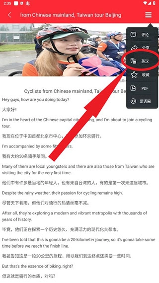 在头条页面,用户需点击右上角的三条杠,英汉互译按钮才会显示并提供中文翻译功能;而在其他页面,中文翻译则会自动呈现。
