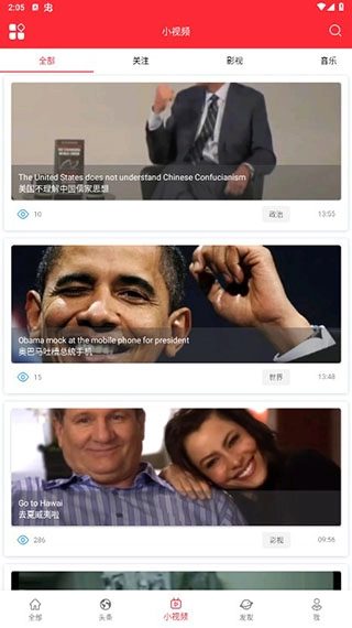 用户点击下方的小视频按钮,就能进入小视频页面。页面里有影视、音乐等各类丰富多样的小视频,用户还可以对这些视频进行关注操作。
